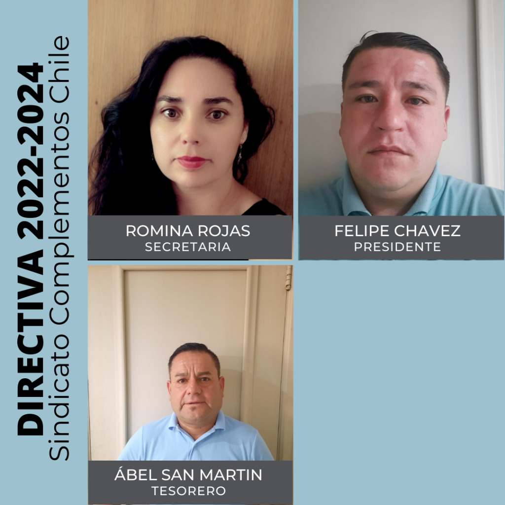 Dado que el Sindicato Complementos Chile tiene más de mil socios, se requiere contar con siete dirigentes sindicales, para abarcar todo el trabajo que conlleva una organización de esta magnitud.